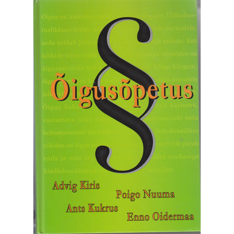 Õpikus käsitletakse riigi ja õiguse põhimõisteid, õigusnormi mõistet ja liike, õigussüsteemi, õigussuhteid ning õiguse rakendamist. Üksikutest õigusharudest käsitletakse tsiviilõiguse üldküsimusi, asjaõigust, võlaõigust ning lepinguid, äriõiguse, pankrotiõiguse ja tööõiguse küsimusi, karistusõiguse põhimõtteid ja Eesti kohtukorraldust. Raamat on mõeldud õpikuna nii bakalaureuse- kui ka kraadiõppe üliõpilastele. Seda saab kasutada ka lai lugejaskond, kellele pakuvad huvi õiguse põhiküsimused.